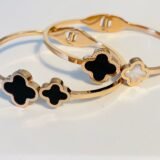 Elegant gold clover bracelet featuring a sleek adjustable bangle design with dual clover charms in black and pearl finish. Lightweight, stylish, and comfortable for daily wear, office use, parties, and gifting. A timeless accessory that adds a touch of sophistication to any outfit.