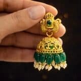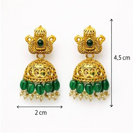 Delicate pearl accents at the base create gentle movement, enhancing the charm of the jhumka silhouette. gold jhumka earrings with green beads for women Despite their ornate appearance, the earrings are well-balanced and comfortable, making them ideal for long celebrations.