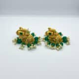 Bring a royal touch to your ethnic collection with these Gold Plated Green Bead Jhumka Earrings for Women. Designed in a beautiful temple-inspired pattern, these earrings feature delicate gold filigree detailing, a striking green stone centerpiece, and green beads with pearl drops that add movement and elegance.