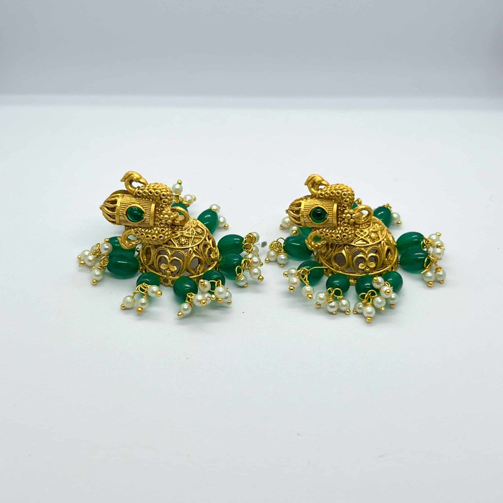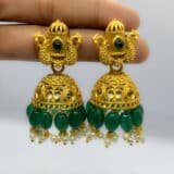 gold plated green bead jhumka earrings for women | temple design earrings | green stone jhumka | indian traditional earrings | antique gold jhumka | pearl drop earrings | ethnic jewellery for girls | festive jhumka earrings | bridal gold earrings | handcrafted temple jewellery