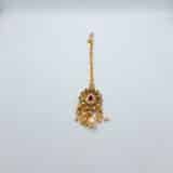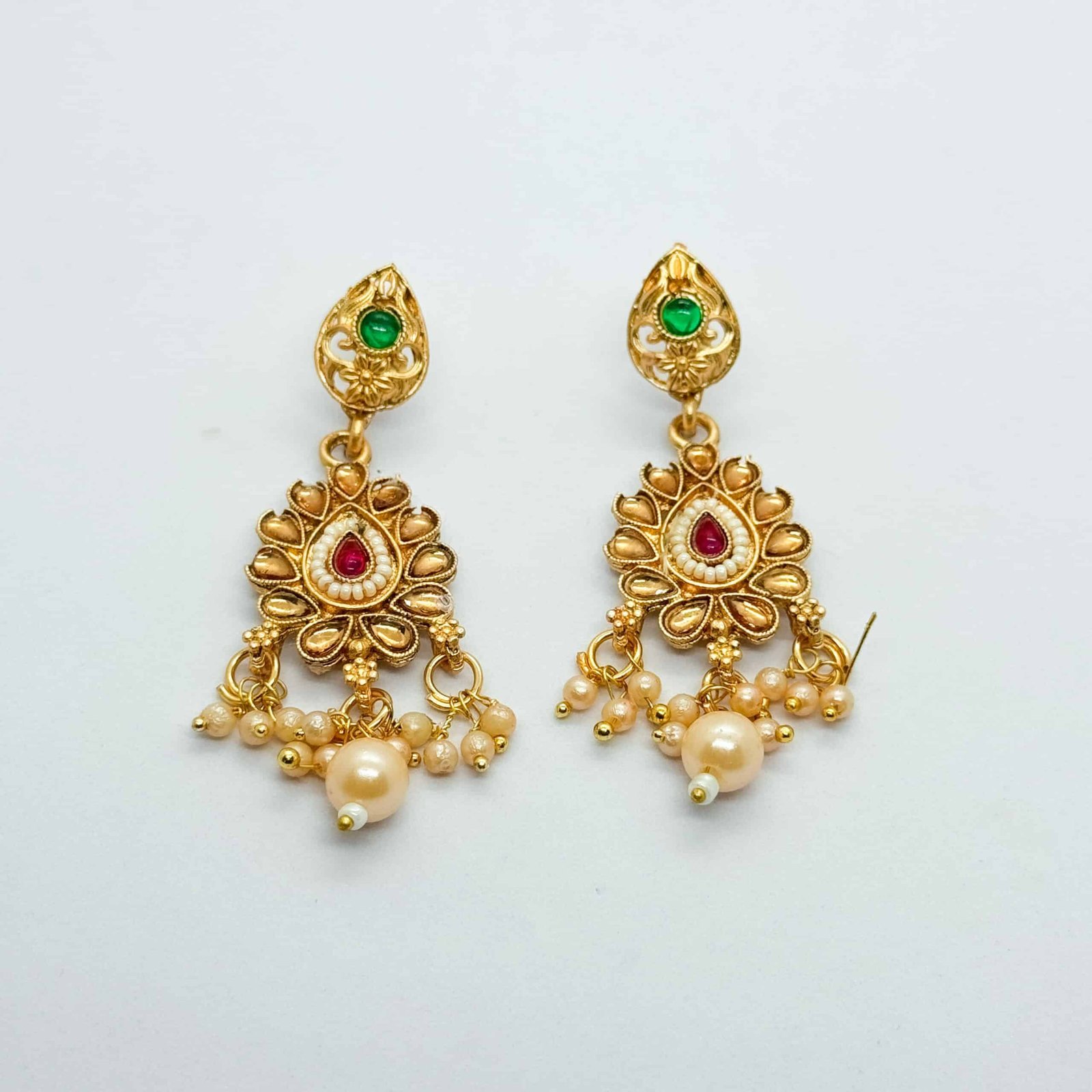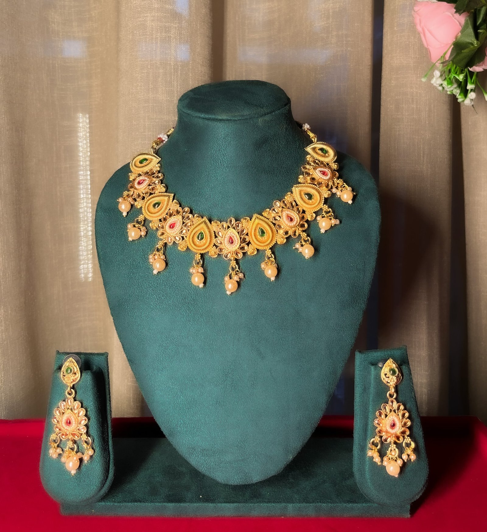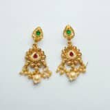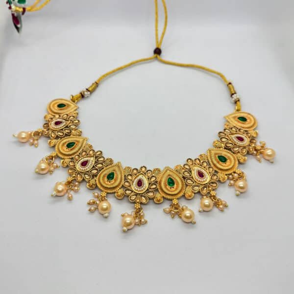 Add a touch of royal beauty to your look with this Traditional Gold Pearl Necklace, crafted with beautiful green and ruby stones. The elegant pearl drops give it a graceful movement and make it perfect for festive and wedding outfits.