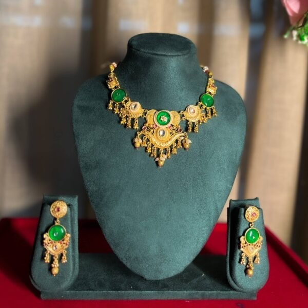 Turn heads with this stunning green stone gold necklace set designed for the modern woman who loves timeless tradition. , the necklace features rich gold plating and intricately detailed with lustrous green stones. The matching earrings complete the look with elegance and charm.